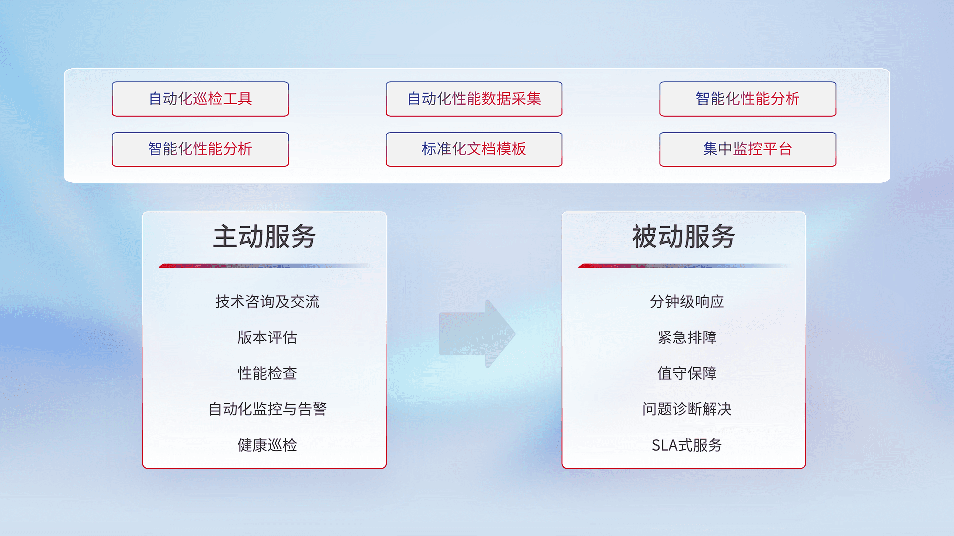 智能化工具和标准化文档,,,保障服务质量,,提供主动服务(包含技术咨询、、版本评估、、、性能检查、、自动化监控与告警、、、、健康巡检)和被动服务包含(分钟级响应、、、、紧急排障、、、、值守保障、、、问题诊断解决、、SLA服务)。。。。